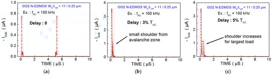 Then, the program (Figure 5) builds up the IDS, ISUB and (ISUB/IDS) time dependences, which one can loop for each delay value (Figure 6b). Results in Figure 7a show the symmetrical peaks of ISUB (t) when no delay is involved (intrinsic case). For 3% delay value (typical digital application) and for 5% value at large load (Figure 7b,c), it induces ISUB peaks only in the VGS rising when VDS is high. Since VGS is limited to VDS/2, it makes the second ISUB peak disappear. We note that a shoulder grows with the delay on the right side of the first ISUB peak due to the increase in ISUB (VGS) in the VGSmax region, as previously shown in Figure 3b, in relation to ELat increase in the N-drift to drain contact region (Section 4).