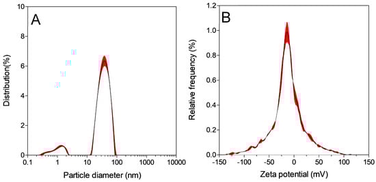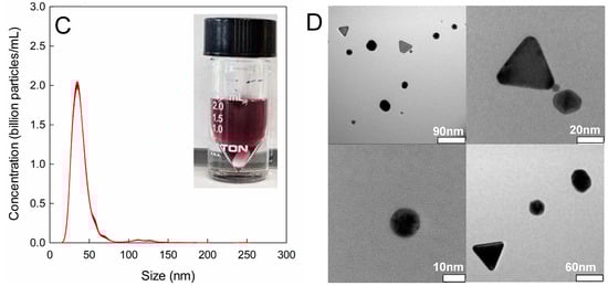 NTA was performed on a NanoSight NS300 (Malvern Panalytical, Malvern, UK) device to discern the size of the nanoparticles that were undergoing Brownian motion. For these measurements, 1 mL of nanoparticle solution was transferred to a 1 mL syringe that was connected to the pump of the device. The particle movement and dispersal of light were recorded by a camera at 25 °C via a blue laser. The mean particle size was 41.4 nm (±0.5 nm), while the particle mode was 35.5 nm (±0.5 nm) with a standard deviation of 19.3 nm (±1.5 nm). The results are shown in Figure 1C).