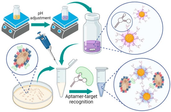- Schmitz, F.R.W.; Cesca, K.; Valério, A.; de Oliveira, D.; Hotza, D. Colorimetric detection of Pseudomonas aeruginosa by aptamer-functionalized gold nanoparticles. Appl. Microbiol. Biotechnol. 2023, 107, 71–80. [Google Scholar] [CrossRef] [PubMed]