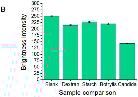 Specificity testing was performed to determine whether polysaccharides containing branched α linked glucans or an abundance of BDG (from Botrytis cinerea) would interfere with the nonspecific aggregation of the nanoparticles. Then, 50 μL of 50 mg/mL dextran solution was added to 50 μL of undiluted nanoparticle solution. Then, 50 μL of 50 mg/mL starch solution was added to 50 μL of undiluted nanoparticle solution. An excess of Botrytis cinerea mycelium (50 mg) was added to the vaginal fluid-mimicking solution with 50 μL of nanoparticle solution. The results were compared to those of the blank solution containing 50 μL of vaginal fluid simulant solution and 50 μL of nanoparticle solution. A positive test for the detection of one Candida albicans colony is also shown for reference. The results showed that compared to those in the blank solution, only minimal nonspecific aggregation occurred in both the dextran and Starch tests. Only minimal nanoparticle aggregation was present within the sample containing Botrytis cinerea mycelia. Notably, the presence of Candida albicans caused a “blue” colour change due to nanoparticle aggregation based on aptamer recognition of the presence of 1,3-β-d glucan molecules. This “blue” colour is distinct from that of the nonspecific targets (dextran, starch and Botrytis) and the blank solution, demonstrating the specific detection of one colony of C. albicans based on the specific aptamer recognition of C. albicans 1,3-β-d glucan molecules. Colorimetric results were visible for each sample within 5 min of adding the nanoparticles. Red channel brightness intensity analysis revealed that the nontargets (dextran, starch and Botrytis cinerea) were comparable to the blank solution. Moreover, the red channel brightness intensity significantly decreased for the positive detection of C. albicans. The results are shown in Figure 3.