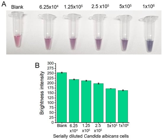 (A) shows serially diluted samples of Candida albicans fungal cells. Serial dilutions ranged from 1 × 106 cells (blue) to 6.25 × 104 cells (pink). As the concentration of Candida albicans fungal cells decreased, each solution more closely resembled the pink blank solution. (B) Images of the serially diluted Candida albicans fungal samples. As the concentration of Candida albicans fungal cells decreased, so did the red channel brightness intensity. Conversely, as the concentration of Candida albicans cells increased, the solution turned more “blue” due to increased nanoparticle aggregation and, therefore, a decrease in the red channel brightness intensity was observed.