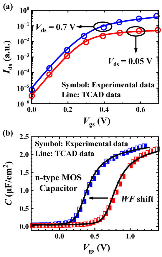 TCAD simulation calibrations against the experimental data under the same simulation environment. (a) Calibrated Ids–Vgs characteristics of n-type NSFET versus experiment data from Ref. [10], and (b) C–V characteristics of n-type MOS capacitor versus experimental data from Ref. [35].