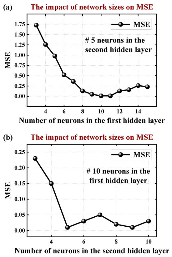 The MSE for all the test samples with different numbers of neurons in the first hidden layer (a) and second hidden layer (b).