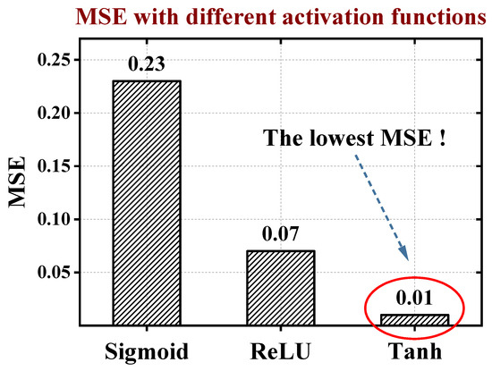 Besides, we investigated the impact of different types of activation functions of the neurons on MSE for the test dataset, as depicted in Figure 5. Using the hyperbolic tangent function has the lowest MSE. Through our analysis, the function is zero-centered, meaning its mean is zero. This is beneficial for optimization algorithms such as gradient descent, as it helps prevent the gradient updates from consistently favoring a particular direction, thus improving the convergence speed of the model. The derivative of the function is non-zero in most regions, aiding in the propagation of gradients during backpropagation. Unlike the sigmoid function, the gradient of does not approach zero in regions of large or small inputs, reducing the risk of the vanishing gradient problem.