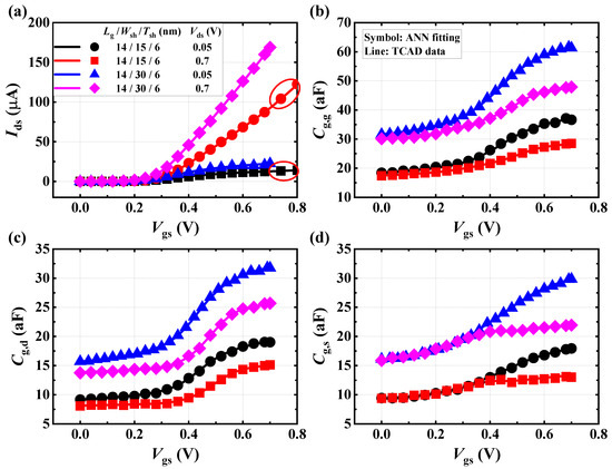 Here, we summarize the primary parameters of the proposed ANN model, as shown in Table 2. Based on the experiments and analysis, we can utilize the ANN model to predict the current and capacitance output based on input data (Lg, Wsh, Tsh, Vgs and Vds) with MSE of 0.01. As shown in Figure 8, the example results of both the DC and AC characteristics of ANN model are fitted against the TCAD data of high-density and high-performance GAA NSFETs at 2 nm technology node. It can be seen that the output I–V and C–V performances generated by ANN fit well with the TCAD results. In addition, we predicted the I–V performance of the nominal NSFET device at high gate bias (Vgs = 0.7–0.8 V) to examine the model scalability. The extrapolation behavior also fits well to simulation results. The optimistic results reveal that the proposed network is capable of handling the electrical characterization of advanced GAA NSFETs with great accuracy.