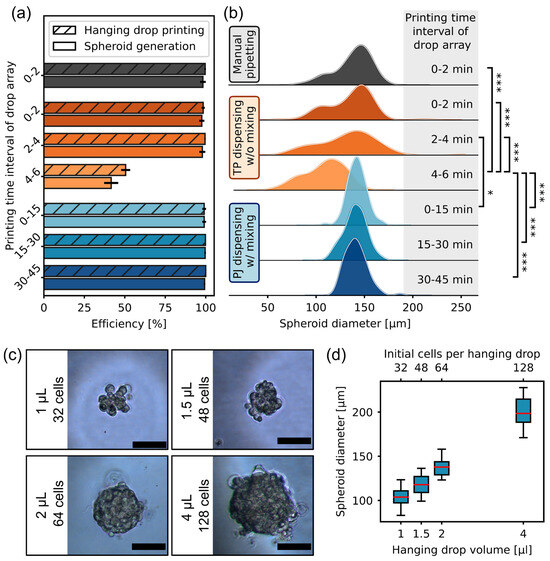 In contrast, TP-based cell suspension printing resulted in a larger CV of the spheroid diameter of (21.7 ± 0.9)%. Thus, a variety of different-sized spheroids were present. In TP-based printing, the reservoir is located above the dispensing nozzle. At the beginning of the dispensing process, cells are homogeneously distributed, and spheroid sizes similar to those obtained with manual pipetting are generated (0–2 min in Figure 2b). However, after a short time without mixing in the reservoir, the cells sediment, and a non-homogeneous cell distribution is manifested in the reservoir, with a higher cell density closer to the nozzle and a lower cell density on the upper layers of suspension in the reservoir. As dispensing continues, the high-cell-concentration layer is dispensed, resulting in either nozzle clogging and low drop generation efficiency (Figure 2a) or an enlarged tail toward larger spheroids (2–4 min in Figure 2b). After the high-cell-concentration layer is dispensed, only the low-cell-concentration suspension remains in the reservoir, resulting in smaller spheroid sizes (4–6 min in Figure 2b).