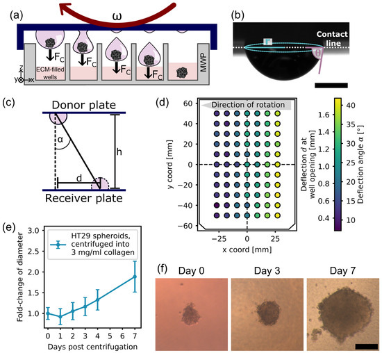 Highly parallelized spheroid harvesting via centrifugation: (a) Schematic illustration of centrifugal detachment of a hanging drop containing a spheroid. Spheroids can be simultaneously transferred into individual wells preloaded with an ECM-mimicking hydrogel, for example. (b) Example of a hanging drop with 2 µL volume. The drop geometry, defined by the contact-line radius of the drop with the substrate and the contact angle between the liquid and the substrate, determines the surface tension force that must be overcome by the centrifugal force for the drop to detach. Scale bar: 1 mm. (c) Schematic illustration of drop deflection due to the Coriolis force that appears as a consequence of the donor and receiver plates rotating on a circular path. (d) Measurement of the absolute deflection and the deflection angle of 2 µL drops across an MWP due to the Coriolis force at a centrifugal acceleration of 25 g. The explanation for the position dependence of the deflection angle is provided in supplement Figure S3. (e) Growth of spheroids from the colon cancer cell line HT29 that were centrifuged from hanging drops into individual wells of a 384-MWP preloaded with 3 mg/mL collagen (n ≥ 30). (f) Example of an HT29 spheroid centrifuged from a hanging drop into a collagen matrix. Day 0 was the day of centrifugal transfer from the drop into the hydrogel. Scale bar: 100 µm.