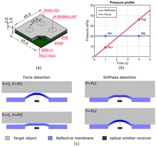 The operating principle of the sensor is based on the QRE113 miniature reflective object sensor (Semiconductor Components Industries LLC, Scottsdale, AZ, USA), as reported in Figure 1c. Schematically, it can be represented by an integrated circuit comprising a photodiode and a phototransistor. QREE113 uses the change in collector current to measure the distance between the sensing element and the reflective surface of the target by emitting and receiving light in the infrared range ( nm). The initial distance between the optoelectronic elements and the top layer was chosen according to the characteristic response of QRE113, to allow force and stiffness detection depending on the actuation pattern. As shown in Figure 1b,c, force sensing is obtained by applying a constant and positive pressure within the chambers, such that the response to contact results smoother. Differently, when the applied pressure follows a ramp pattern from 0 to 45 , the trend of the indentation depth allows the system to recognize the stiffness of the target.