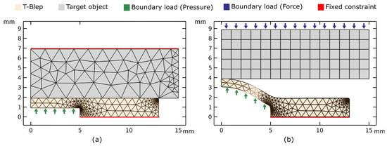 2D axisymmetric model employed in the FEA study with a membrane thickness of 1 mm. (a) Mesh configuration utilized for stiffness simulation. (b) Mesh design utilized for force analysis, considering the T-Blep pressurized to a specified pressure.