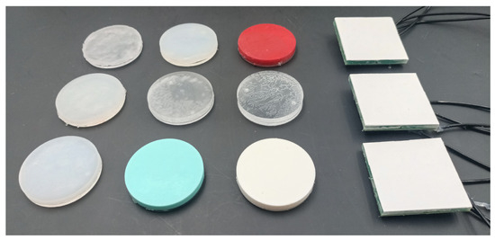 To characterize the stiffness detection, a set of nine specimens was used to generate the dataset to train the classifier to recognize extra-soft, soft, and rigid targets, as show in Figure 4. Each of the specimens used was fabricated having a diameter of 50 and a thickness of 5 . The material used were Ecoflex Gel™ (Smooth-On, Inc., Macungie, PA, USA), Ecoflex 00-30™ (Smooth-On, Inc., PA, USA), DragonSkin 10™ (Smooth-On, Inc., PA, USA), DragonSkin 30™ (Smooth-On, Inc., PA, USA), Sylgard 186 (Dow Chemical Company, Midland, MI, USA), SmoothSil 960 (Smooth-On, Inc., PA, USA), TPU 95A ((Ultimaker B.V., The Netherlands), ABS (Ultimaker B.V., The Netherlands), and Plexiglass. Each material sample was selected based on its Young’s modulus, as detailed in Table 2. Even though the Young’s modulus of a material with unknown geometry cannot reliably serve as an indicator of stiffness, in the present protocol such an inference is permissible since the geometry is predetermined and equal among samples.