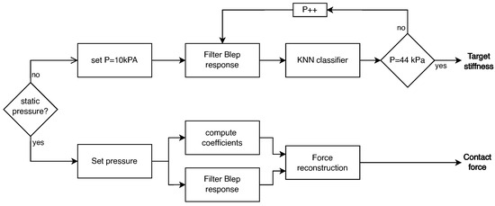 Schematic representation of the methodology for stiffness and force detection. The sensor operates as a stiffness detector during dynamic pressure increase and as a contact force detector under static pressure. Force reconstruction employs a polynomial approach with coefficients computed online, while stiffness detection utilizes a KNN classifier.