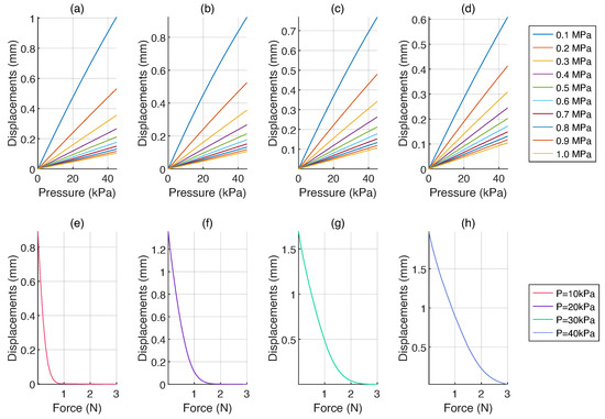 Results of the FEM analysis. (a–d) Displacement variations in response to changing membrane thickness and target stiffness under increasing pressures in the range 0 kPa to 45 kPa. The configurations are presented as follows: (a) Membrane thickness: mm; (b) Membrane thickness: mm; (c) Membrane thickness: mm; and (d) Membrane thickness: mm. (e–h) Displacement variations as a response to force in the range 0 to 3 when the T-Blep pressure results fixed at: (e) 10 kPa; (f) 20 kPa; (g) 30 kPa; and (h) 40 kPa.