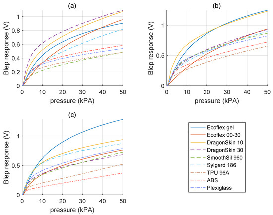 Sensor response variation to specimens with different stiffness levels during the experiment under pressure ranging from 0 to 40 kPa. Each graph corresponds to a distinct sample: (a) Sample 1, (b) Sample 2, and (c) Sample 3.