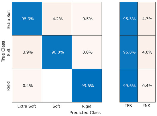 Figure 8 shows the confusion matrix for the KNN trained on the interval 10 kPa to 44 kPa. On this interval, the classification performs best, reaching a validation accuracy (VA) of . Specifically, the false negative rate (FNR) results are always below 5% with a peak of 4.7% to extra soft material, which in 4.2% of the cases are wrongly classified as rigid. Similarly, soft materials are improperly identified as extra soft in 4% of cases, while only in 0.4% of cases rigid materials are wrongly identified as extra soft.