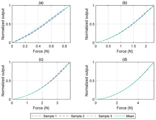 Figure 7 shows the indentation outcomes for the three samples, where higher voltages correspond to larger indentation. The curves reflect measurable differences in indentation depths, thus discriminating between specimens with different stiffnesses. While the theory suggests a correlation between larger and smaller indentation depths into softer and rigid materials, respectively, even minute misalignments of the two contact surfaces can introduce errors that prove wrong the previous statement.