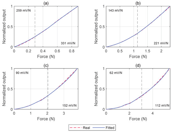 While (3) allows a direct estimation of force from the normalized signal, the sensitivity and Full Scale Output (FSO) can be adjusted online since the coefficients and parameters used for both normalization and force estimation only depend on the pressure imposed on the regulator within the range 10 to 40 . Consequently, this allows for fine-tuning the sensor’s stiffness, thus expanding the range of detectable forces. A comprehensive elucidation of this methodology is provided in the supplementary information reported in Appendix B.