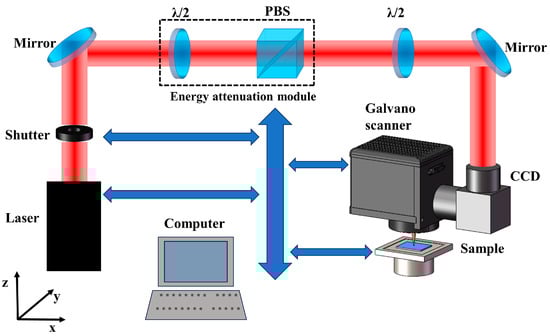 The schematic of the experimental setup is depicted in Figure 1. The femtosecond laser used in this work is a Yb: KGW system (PHAROS, Light Conversion, Vilnius, Lithuania) with a pulse duration of 290 fs, a wavelength of 1030 nm, and a repetition frequency of 50 kHz. A single-pulse laser with Gaussian intensity distribution is delivered to the two-axis galvanometric scanner (Sunny Technology, Beijing, China) and then focused on the sample surface through an F-theta lens (focal length is 100 mm). The galvanometric scanner ensures accurate movement of the focused spot, and the entire machining process can be monitored online by a connected high-speed CCD (Hikvision, Hangzhou, China). During the experiment, the energy can be continuously adjusted through the combination of a zero-order half waveplate and a polarization beam splitter (PBS). The laser polarization can be modulated by a second zero-order half waveplate. The accuracy of the experimental sample’s motion is accomplished by the three-dimensional displacement system (Ludl, New York, NY, USA), which is controlled via high-precision servo motion. To ensure the precision and coordination of the system, all the aforementioned devices communicate with the host computer through serial bus control.