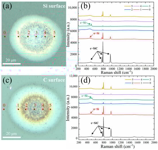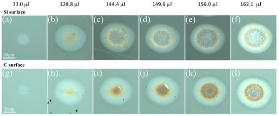 Figure 2a,b and Figure 2g,h shows the modified zone and the structural transformation zone of the Si surface and the C surface when the single-pulse radiation energy is 33.0 μJ and 128.1 μJ, respectively. Hence, the thresholds were calculated at 3.231 J/cm2 and 12.54 J/cm2, respectively. In fact, as the number of irradiation pulses increases, the sample’s ablation threshold will decrease even further until it reaches a saturation state. This phenomenon was observed in a relevant study conducted by Wang et al. [35,36].