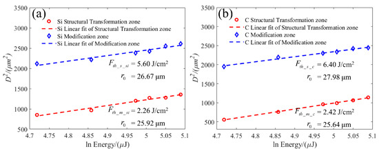 Therefore, the mathematical model between the ablation diameter and the ablation threshold in the structural modification zone and the structural transformation zone of the Si and C surfaces can be obtained as follows: