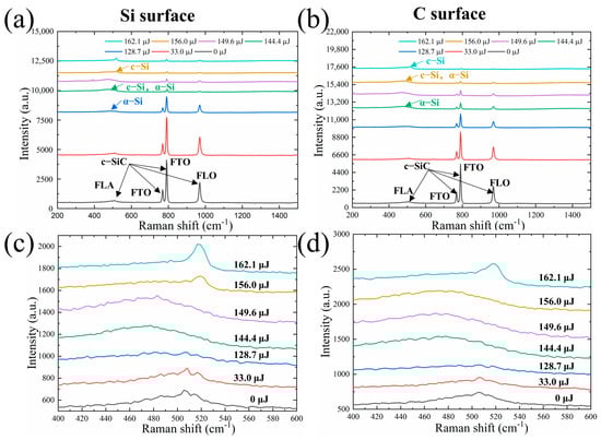Raman spectrum of SiC irradiated with different laser energies. (a,c) Raman spectra of Si surface irradiated with different energies. (b,d) Raman spectra of C surface irradiated with different energies.
