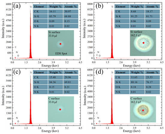 Energy dispersive spectrum (EDS) was used to analyze the elemental changes in the ablated region. At energies of 33.0 μJ and 162.1 μJ, respectively, the central regions of the ablated structures on the Si and C surfaces were scanned by the EDS. The results are shown in Figure 6. The analysis indicates that Si, C, and O elements are the primary constituents of the irradiated region. The compositional distribution of the ablated region on the Si surface is shown in Figure 6a,b. Si and C elements are the main elements in the ablated region under a low energy of 33.0 μJ irradiation. As the energy level increases to 162.1 μJ, the Si element content gradually increases, while the C element content decreases. Simultaneously, the O element content remains nearly unchanged. This is because single-crystal SiC undergoes almost no structural changes or formation of new phase materials under low-energy laser irradiation; whereas under high-energy irradiation, SiC will explode into Si and C vapor and melt particles at high temperature and pressure, and the Si and C vapor will react with O elements in the air environment to form Si and C oxides. Si and O elements react and eventually accumulate on the surface of the material as Si oxides, and C and O react to produce CO and CO2. Therefore, the percentage of Si elements increase and the percentage of C elements decrease [37,38].
