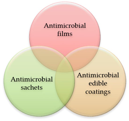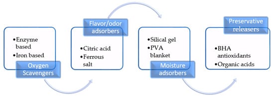 When specific additives are integrated into packaging film to extend the shelf life of food products, the package composition is considered active []. This active food packaging can seek out moisture, oxygen, odor taints, antioxidants, preservatives, antimicrobials, enzymes, etc. []. The creation of active packaged food materials involves adding active compounds to the template of existing packaging materials or immobilizing antioxidants on the surfaces of the packaging film to improve its functionality []. Figure 2 describes several foods that have benefited from active packaging technology.