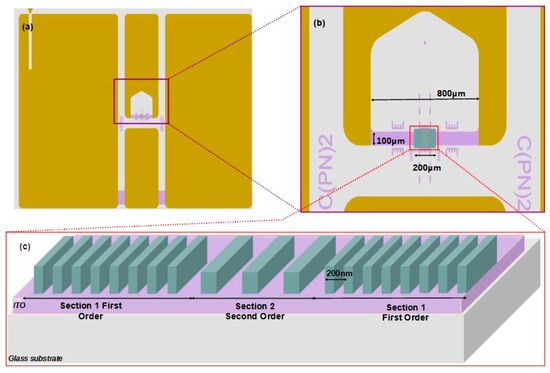 Intermediate ends of the CPW electrodes are terminated with un-metallized 100 µm large and 800 µm long ITO arms (vertical in the picture), in the middle of which a 250 µm long region was thinned down to 50 nm to improve the confinement factor and to maximize the index contrast. This region is intended for the µ-cavities to be integrated, as illustrated in Figure 8b. It appears as a pale-bluish rectangle, whereas the un-thinned ITO arm is brownish-rose. The implemented µ-cavities appear as a dark square overlapping the thinned sections, as shown in Figure 8c. Note the presence of markers and rulers to facilitate the alignments and the localization and centering of the DFB pattern with respect to the ITO arm.