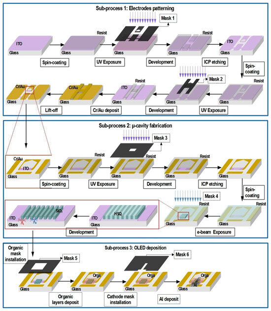The fabrication of the high-speed OLED with integrated mixed-order DFB cavity requires four main sub-processes, which are divided into sub-tasks, as illustrated in Figure 2. In the current work, we further detail, in sub-process 2, the integration of micro-cavity on the anode.