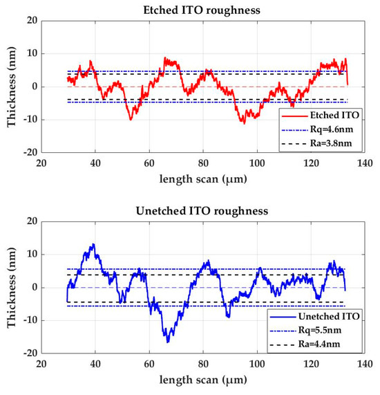 The optimal ITO thickness is the result of a trade-off between two aspects: an optical aspect and an electrical one. From the optical perspective, the optimal confinement factor maximizing the optical field in the organic layers is achieved with 50 nm thin ITO, as explained in [16]. However, from the electrical point of view, increasing the thickness of the ITO layer helps to decrease the serial resistance to improve the carrier injection and to prevent voltage drop across the OLED and to minimize localized heating. The optimal standard commercial ITO thicknesses for OLEDs are conventionally 140 nm (15 Ω/☐) and 340 nm (5 Ω/☐). To achieve 50 nm thin ITO active area while keeping the rest of the ITO arm as thick as possible, standard commercial ITOs are etched by inductively coupled plasma (ICP), as shown in Figure 2. A CH4/Cl2-based plasma etching process using parameters shown in Table 1 was applied to etch the 100 µm × 200 µm region centered in the middle of the anode arm (Figure 1b). This etching method offers the advantage of favoring a vertical engraving profile by combining both a chemical etching effect (plasma) and a highly anisotropic physical etching effect (ionic bombardment). However, it lacks selectivity. Further investigation led to the identification of the optimal ITO/photoresist etching selectivity using He/Ar [28,29]. Figure 3 shows the roughness of the etched ITO in the active area and that of the unetched ITO part, which is Rq = 4.6 nm (Ra = 3.8 nm) and Rq = 5.5 nm (Ra = 4.4 nm), respectively. This small difference in roughness is compatible with an OLED deposition of hundreds of nm.