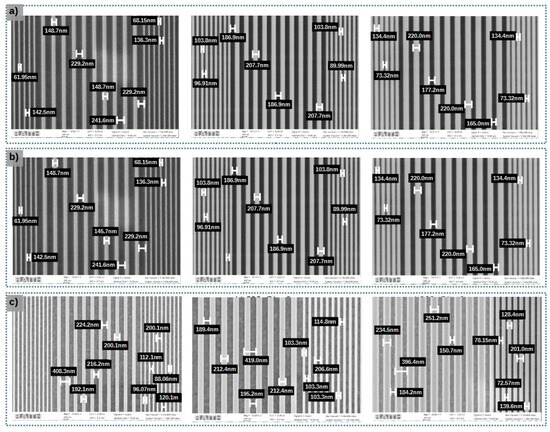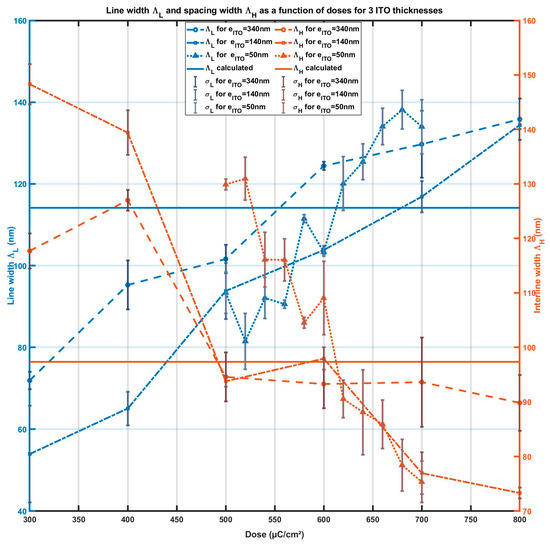 To determine the optimal doses, we varied the doses within a range of 300 µC/cm2 to 800 µC/cm2. Figure 4 presents the SEM observations of the electron-beam lithography for ITO thicknesses of 340 nm for line a, and ITO thicknesses of 140 nm for line b, with doses of 400 µC/cm2, 600 µC/cm2, and 800 µC/cm2. Line c presents the SEM observation of e-beam lithography for ITO thicknesses of 50 nm and doses of 500 µC/cm2, 600 µC/cm2, and 700 µC/cm2. Figure 5 presents the measured line width (orange curves) and interline spacing width (blue curves) as a function of the doses and for ITO thicknesses of 340 nm (solid line), 140 nm (discontinued lines), and 50 nm (dash lines). The targeted values are presented by a horizontal magenta line for the SiO2 line width and cyan line for the interline spacing. This study confirms that the optimal dose depends on the thickness of the ITO layer. Our analysis leads us to the following conclusion: the optimal charges per area for the samples with ITO thicknesses of 340 nm, 140 nm, and 50 nm are 500 µC/cm2, 600 µC/cm2, and 620 µC/cm2, respectively.
