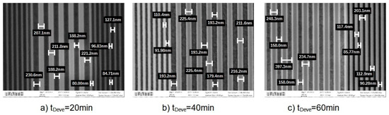 The time of development also needs to be adjusted according to the previous parameters. For this study, which uses a 140 nm thick ITO anode, the targeted line width and interline spacing are and . For several doses from 300 µC/cm2 to 800 µC/cm2, we study the impact of the development time on the pattern accuracy. Figure 6 presents the SEM observations of the electron-beam lithography for different development times (20 min, 40 min, and 60 min) for ITO thicknesses of 140. Figure 7 shows the measured line width and the interline spacing as a function of the dose for different development times: 20 min (solid lines), 40 min (discontinued lines), and 60 min (dashed lines). The targeted values are represented by the cyan line for interline spacing and the magenta line for the SiO2 line. The optimal development time is between 20 and 40 min.