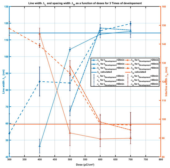 Line width ΛL and spacing ΛH as a function of the dose of exposure for 3 development times: Blue curves correspond to the width of the SiO2 lines ΛL. Orange curves corresponds to the spacing width ΛH; dashed lines for 20 min, dash-dotted lines correspond to 40 min, dashed lines correspond to 60 min. Solid lines are the targeted values of ΛL (blue) and ΛH (orange).