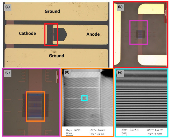 Top views of device: optical microscope: (a) the CPW electrodes, (b) zoom of (a) to present the position of the cavity relative to the electrodes, (c) zoom of (b) showing the mixed-order cavity in the thinned ITO anode, (d) SEM observation of the mixed-order cavity and (e) zoom of (d) showing the first-order gratings separated by the second-order grating.