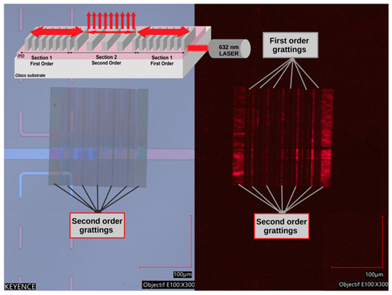 A top view of the sample under ambient illumination and without laser injection is shown in Figure 9 left, where the ITO horizontal stripe exhibits two colors; on the left part, the 50 nm thick stripe is light-purple-blue, whereas on the right part, the 140 nm thick ITO stripe is dark-rose. The 200 µm × 200 µm DFB pattern overlaps the horizontal stripe and, on each ends, the second-order sections appears slightly darker as well as the narrow second-order sections. Figure 9 right, shows the same pattern in the dark with 632 nm laser light injected from the right side. The light intensity decreases from right to left, with larger illumination corresponding to second-order grating sections. The second-order sections located on both the 50 nm thin and 140 nm thick ITO sections clearly diffract light contrary to first-order sections. The ITO horizontal stripe is visible on the right side, where the thickness is 140 nm, which allows several waveguided modes to exist contrary to the 50 nm thin ITO stripe part. This confirms that second-order grating effectively couples light out of the plan of the grating.