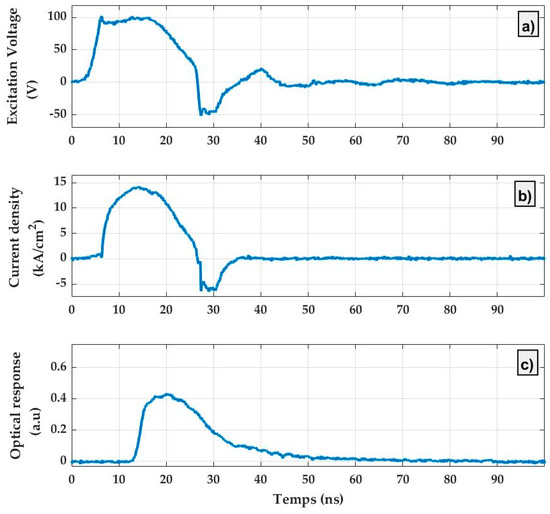 Time-resolved response of an OLED with a mixed-order DFB micro-cavity subjected to a single pulse of 105 V and of 20 ns in duration: (a) excitation signal, (b) current density response, and (c) optical response.