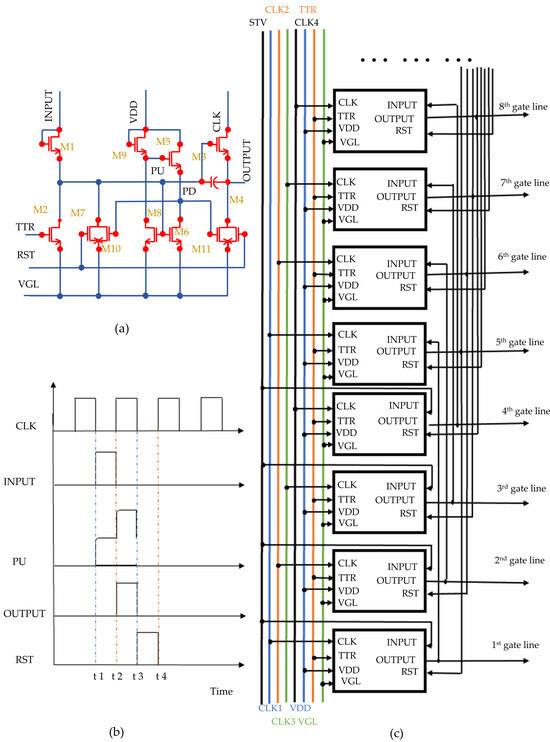 Figure 2 presents the schematic of the gate driver used in this study, consisting of three distinct sections [19]: (a) the single-stage circuit schematic, (b) the timing diagram, and (c) the block diagram. The single-stage circuit (a) features a capacitor C1 alongside 11 TFTs (M1–M11) [20], where M1 is the input TFT, M3 is the driving TFT, and M2, M4–M10 are the reset TFTs. This circuit operates through four phases: Pre-Charge Period, Pull-Up Period, Pull-Down Period, and Low-Level Holding Period [21,22]. Within this circuit, the PU node acts as the pull-up point to control the OUTPUT signal, while the PD node serves as the pull-down point. This configuration enables the progressive scan-driving function of the LCD panel. The scanning drive circuit operates as a shift register, generating a shift pulse signal as the OUTPUT signal in response to external control signals. This OUTPUT signal simultaneously activates the TFTs in the current row and also functions as the initiation signal for the next row and the termination signal for the previous row, presenting the driving principle of the novel liquid crystal panels.