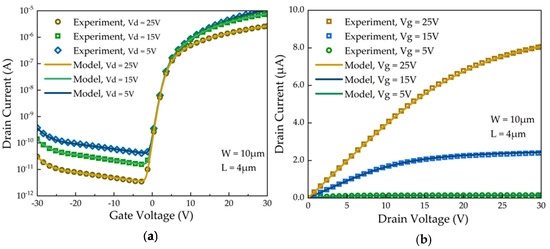 To develop precise circuit models, we performed detailed feature extraction on a-Si TFT devices used in pixel-driving circuits. These extracted features are critical for subsequent simulation and verification processes. Figure 3a,b display the parameter extraction results for these TFT device models. Specifically, Figure 3a shows the transfer characteristic curve of a-Si TFT, and Figure 3b presents its current characteristic curve. The linear root mean square error (LinRMS) values in the linear and saturation regions are 0.92% and 1.59%, respectively. Moreover, Figure 3b demonstrates the electrical characteristics of a-Si TFTs in off, transition, and on states, with LinRMS values for these states being 2.27%, 2.81%, and 0.82%, respectively. The pixel-driving circuit investigated in this study incorporates a TFT device with a channel width of 10 µm and a channel length of 4 µm.