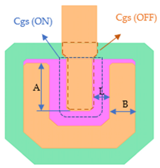 Figure 4 presents a U-shaped TFT design. This design efficiently increases the channel width while minimally enlarging the total TFT area. Due to its resemblance to the letter ‘U’, the channel is termed U-shaped. This design strategy balances the control of both the area and the of the TFT. In the on state, the area, outlined by a blue dotted line and determined by the gate insulating layer’s thickness between the gate metal and the active layer is visible. In contrast, during the off-state, the area, marked by a red dotted line, predominantly overlaps the region between the drain and gate metals. The thickness of this area is represented by the combined thickness of both metal layers, expressed as .