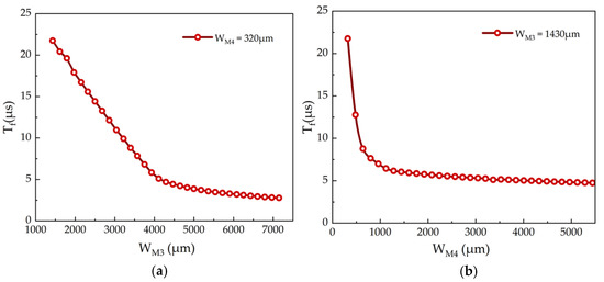 These calculations facilitate the determination of dimensions corresponding to various channel widths, enabling further layout design and analysis. The OUTPUT signal primarily originates from transistor M3, making it the most directly associated TFT with the OUTPUT signal. Simultaneously, the conduction of M4 significantly reduces the OUTPUT signal, affecting the fall time . Other TFTs in the circuit mainly function as switches or for noise reduction. Figure 5a,b illustrate the relationship between the and the channel widths of M3 and M4, respectively. The simulation results indicate an inverse relationship between and : decreases as increases from 1430 µm to 7150 µm. Similarly, with fixed at 1430 µm, an increase in from 320 µm to approximately 1000 µm results in a reduction of . This finding is consistent with Equation (12).