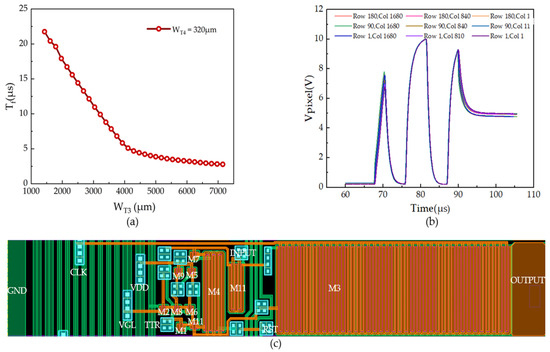In our study, the optimal widths for M3 and M4 are established through a series of simulation experiments under fixed layout design parameters. These simulations demonstrate that a width of 6790 µm for M3 and 640 µm for M4 achieve the shortest OUTPUT signal and the highest pixel charging ratio. Specifically, the of the OUTPUT signal is recorded at 2.6572 µs, while the pixel charging ratio reaches 90.61275%. The configuration of M3 and M4 transistors influences the value and charging ratio, as presented in Figure 6a. The experiment is conducted within a constant layout area, and the results show that as the channel width of M3 increases, the channel width of M4 correspondingly decreases. However, it is not simply a case of “the larger, the better” for the M3 channel width. The optimal charging rate occurs when M3’s width is 6790 µm and M4’s width is 640 µm. Further increasing M3’s channel width beyond this point leads to a reduction in the charging ratio. The essence of achieving the highest charging ratio lies not solely in maximizing dimensions but in striking a delicate balance that ensures the most efficient charging process.