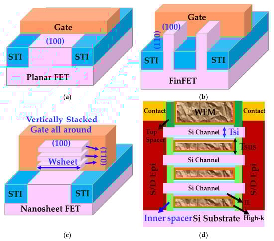 Carrier transport in planar devices is through (100) surface orientation. Contrastingly, in FinFET, carrier conduction primarily takes place through (110) sidewalls, complemented by the (100) Fin top. The predominant approach for nanosheet fabrication is to construct them on a (100) bulk Si wafer [6,7], featuring conduction mainly through (100) surface orientation of sheet top and bottom in addition to (110) side walls and arcuated corners [7,10].