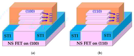 Schematics of GAA NS FETs fabricated on (a) (100) and (b) (110) surface orientations.