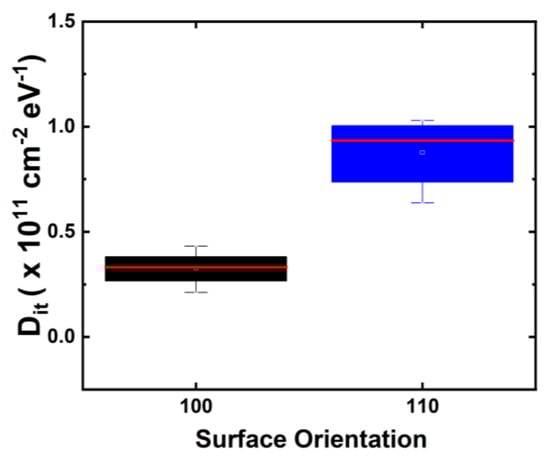 Comparison of Dit levels in GAA NS fabricated on (100) vs. (110) surface orientation extracted with AC conductance method [15,16,17], showing a higher initial Dit in NS FETs with (110) top surface than (100) [14], both lower than 1 × 1011 cm−2 eV−1. Reprinted/adapted with permission from IEEE Proceedings of the 2020 International Reliability Physics Symposium.