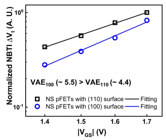 Comparison of NBTI-induced Vt shift (ΔVt) as a function of absolute stress gate voltage (|VGS|) in GAA NS devices fabricated on (100) vs. (110) surface orientations, showing higher NBTI degradation in (110) surface orientation [14]. Reprinted/adapted with permission from IEEE Proceedings of the 2020 International Reliability Physics Symposium.