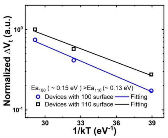 GAA NS devices were fabricated on both (100) and (110) surface orientations [14], as illustrated in Figure 2. Initial interface trap densities (Dit) of GAA NS devices were extracted with AC conductance methods [15,16,17] and plotted in Figure 3. The median Dit of more than 10 NS devices on the (100) top surface is roughly 3.4 × 1010 cm−2 eV−1 in contrast to 9.3 × 1010 cm−2 eV−1 for NS devices with (110) top surface [14]. Figure 4 illustrates the comparison of NBTI degradation as a function of stress gate voltage (VGS) between GAA NS with (100) and (110) top surface orientations. Briefly, >1.5× worse NBTI degradation after 1000-second (s) of stress at −1.2 V was observed in NS dominated by (110) conduction, attributed to higher silicon-hydrogen (Si-H) bond density in (110) compared to (100) surface orientation [10,14]. A slightly higher activation energy (Ea) of NBTI, ~0.18 eV, was observed in Ref. [10] than in FinFET, and a higher Ea of 0.15 eV was reported in NS with (100) than that of 0.13 eV in (110) surface orientation (Figure 5) [14], owning to the different temperature dependence between hole trapping and interface trap components.