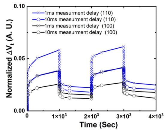 AC NBTI in NS with (100) and (110) surface orientations during alternating stress and recovery cycles are compared for different sensing delays of 1 ms and 10 ms in Figure 6 [14]. It is worth pointing out that 1.5× worse NBTI degradation is observed in NS with (110) top surface compared to (100) with both 1 ms and 10 ms sensing delay, right after 1000 s of stress and after 1000 s of recovery, showing not only higher interface trap generation but also more severe hole trapping components in (110) NS than (100).