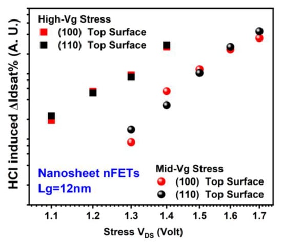 Comparison of HCD (each data point is the mean value of more than seven devices stressed at the same condition) in GAA NS nFETs with (100) vs. (110) top surface orientations [18]. ΔIdsat% is defined as (Idsat0 – Idsat)/Idsat0 × 100%, whereas Idsat0 is the initial saturation drain current. Idsat is the saturation drain current during stress.
