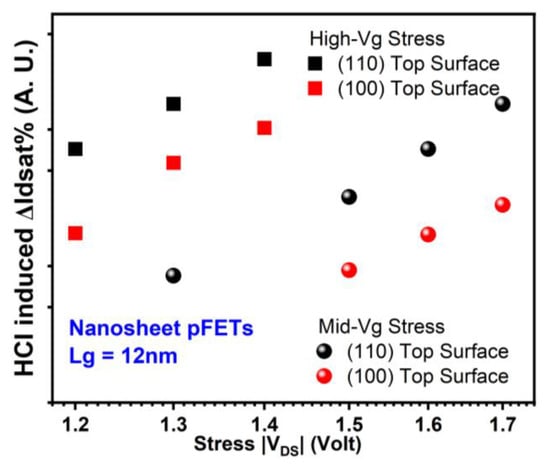 It is important to note that HCD depends highly on current levels [19]. Ref. [20] reported higher electron mobility (~195 vs. ~105 cm2 V−1 s−1 in peak mobility) and lower hole mobility (~73 vs. ~174 cm2 V−1 s−1 in peak mobility) in (100) than (110) surface orientation for the HfO2 gate dielectric with an interfacial layer of less than 10 angstroms. The current in nFETs with the (100) surface tends to be higher than in its (110) counterpart under the same stress voltage, while the opposite is true for pFETs. Therefore, it can be concluded that HCI reliability for both NS nFETs and pFETs is generally inferior in (110) compared to (100), due to a higher Si-H bond density, leading to more interface trap generation during HCI stress.