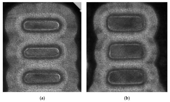 Cross-Fin TEMs of vertically stacked GAA NS devices with Tsi of approximately (a) 5 nm and (b) 8 nm, corresponding to the curvature ranges of 25~50% and 75~100%, respectively, as defined in Figure 10 [10]. Reprinted/adapted with permission from IEEE Proceedings of the 2019 International Reliability Physics Symposium.