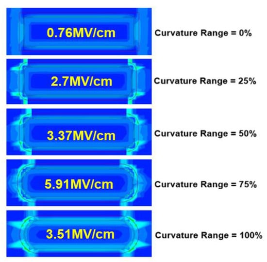 Vertical electric field peaks at sheet corners for GAA NS with different structure (sidewalls and corners) profiles and curvature ranges from TCAD simulation [22]. The vertical field at sheet corners increases as the curvature range changes from 0% to 75% and then reduces when transitioning from 75% to 100% of curvature range. Reprinted/Adapted from [22], under a Creative Commons Attribution-NonCommercial-NoDerivatives 4.0 License. Source: https://creativecommons.org/licenses/by-nc-nd/4.0/. Modifications were made to the original figure.